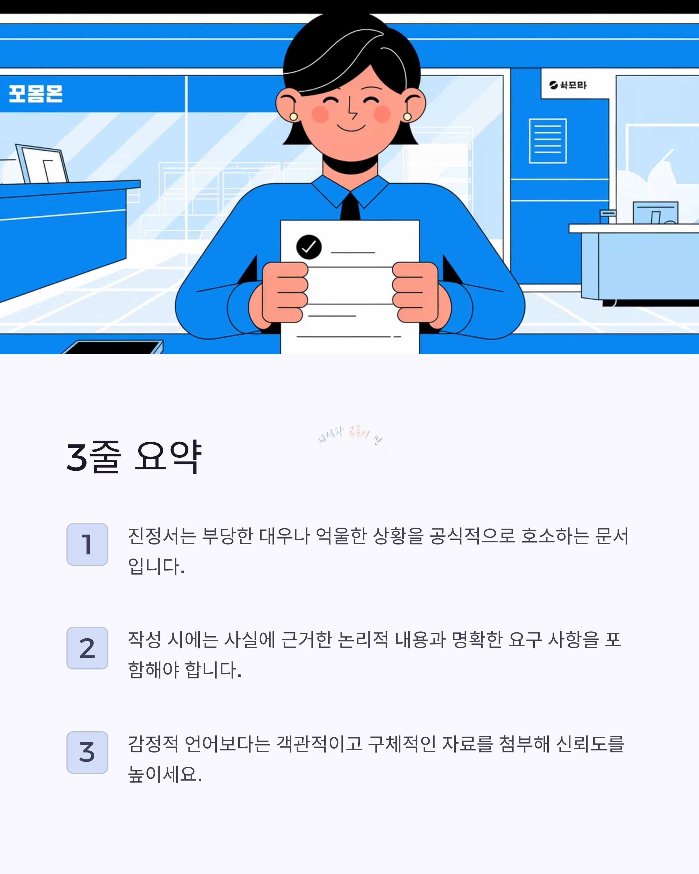 - 감정적 언어보다는 객관적이고 구체적인 자료를 첨부해 신뢰도를 높이세요.