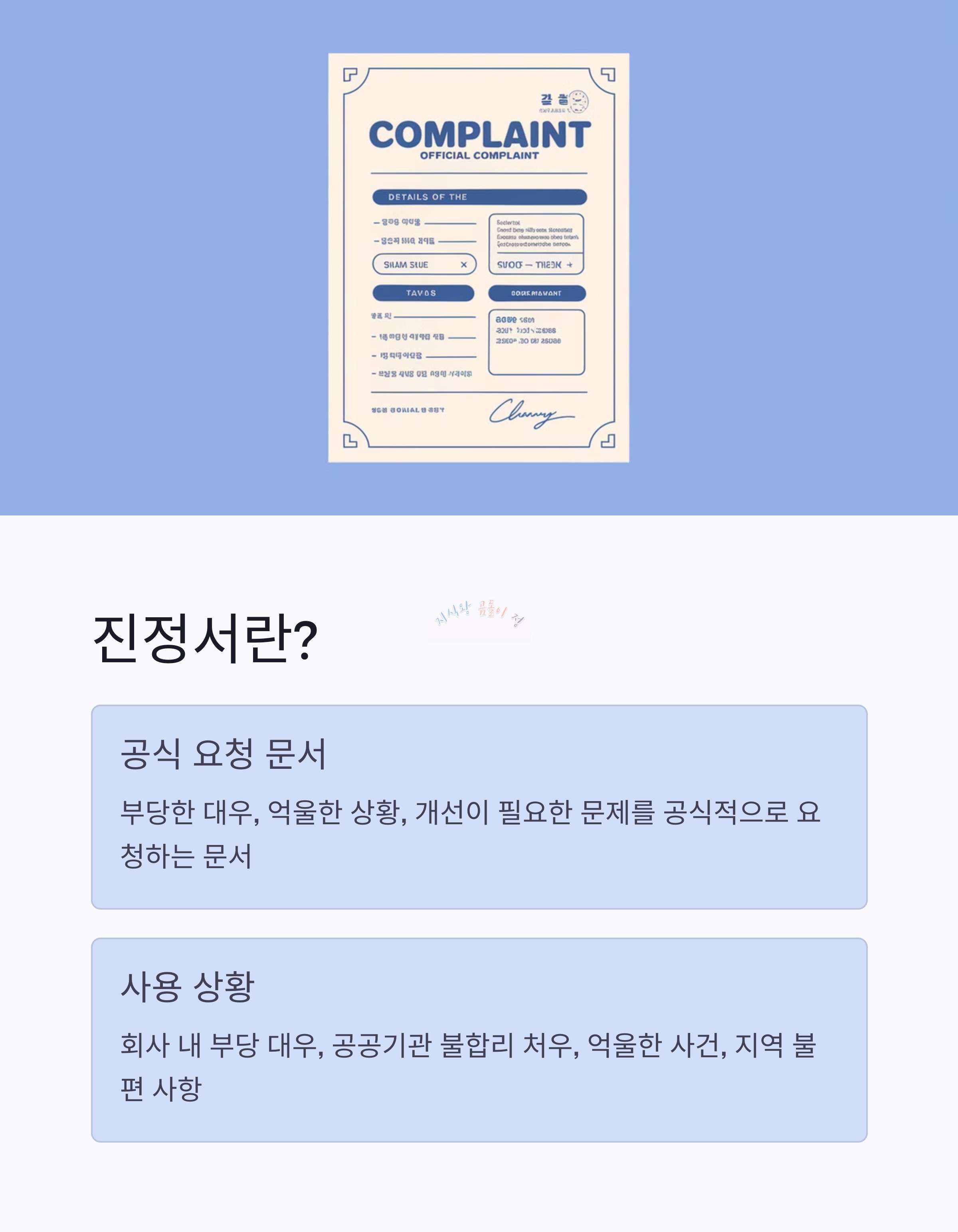 - 진정서는 부당한 대우나 억울한 상황을 공식적으로 호소하는 문서입니다.