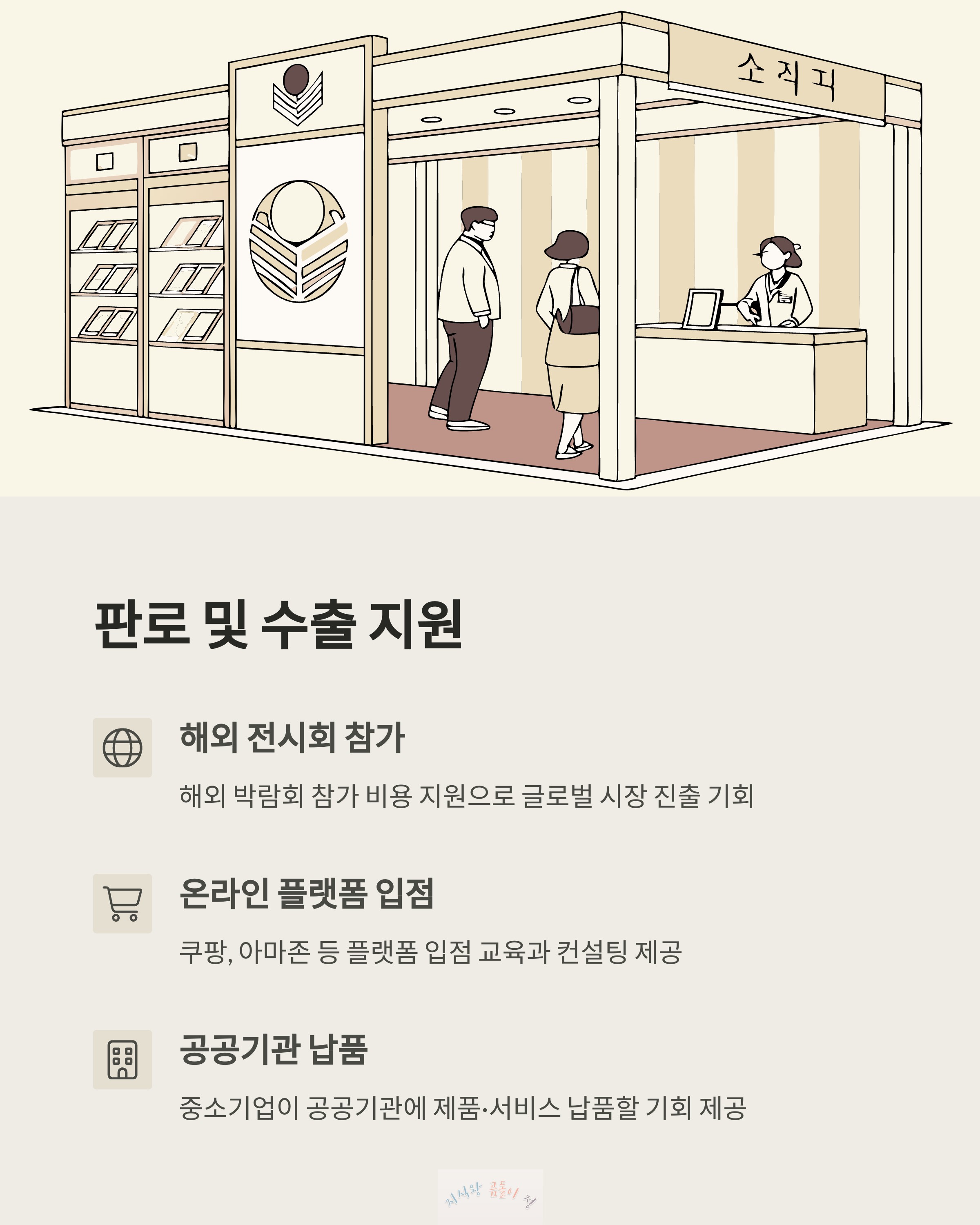 - 온라인 플랫폼 입점 지원: 쿠팡, 아마존과 같은 플랫폼에 입점할 수 있도록 교육과 컨설팅을 제공해요.