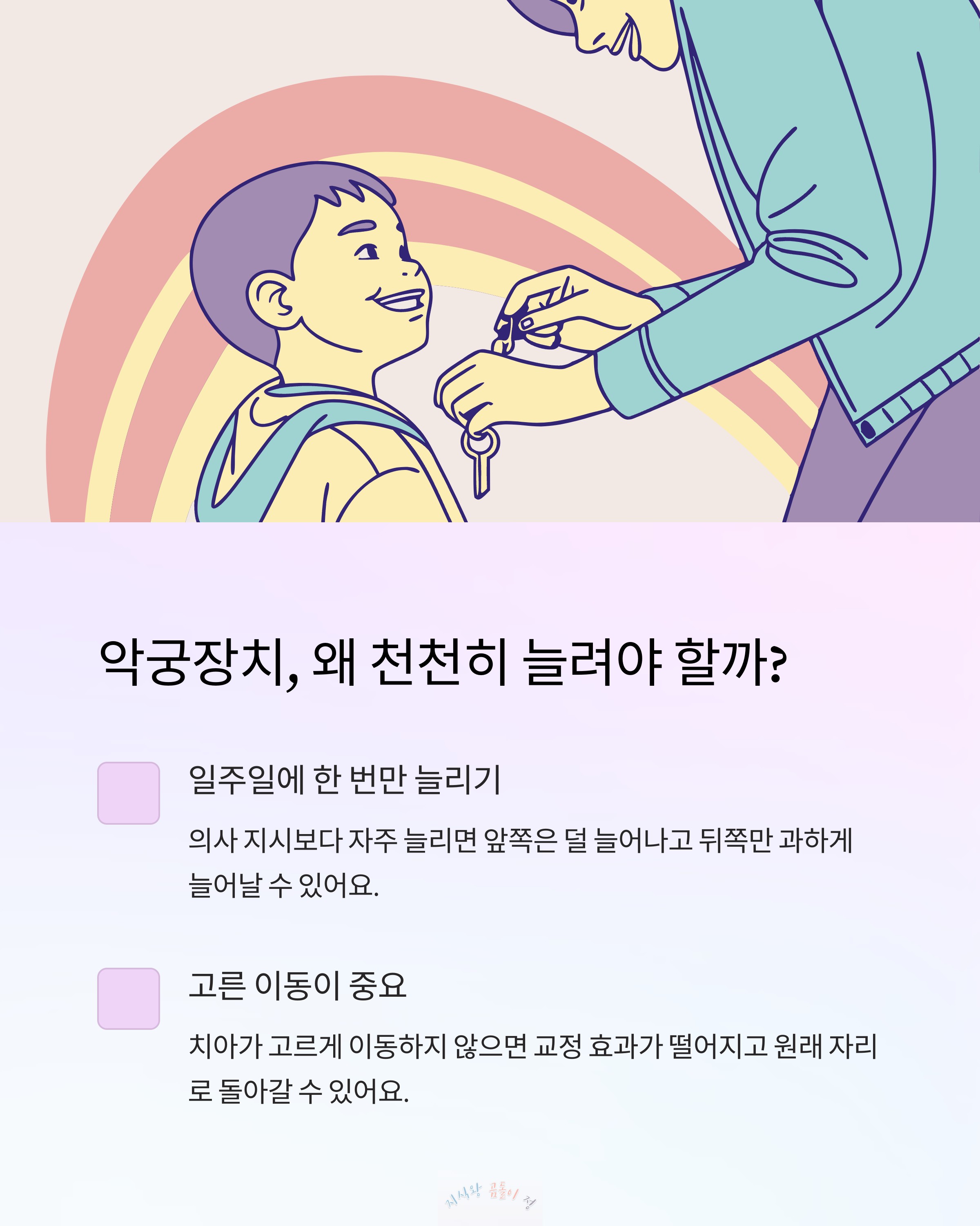 악궁장치는 치아의 이동을 돕는 장치인데, 앞니와 어금니가 고르게 늘어나야 교정 효과가 좋아요.