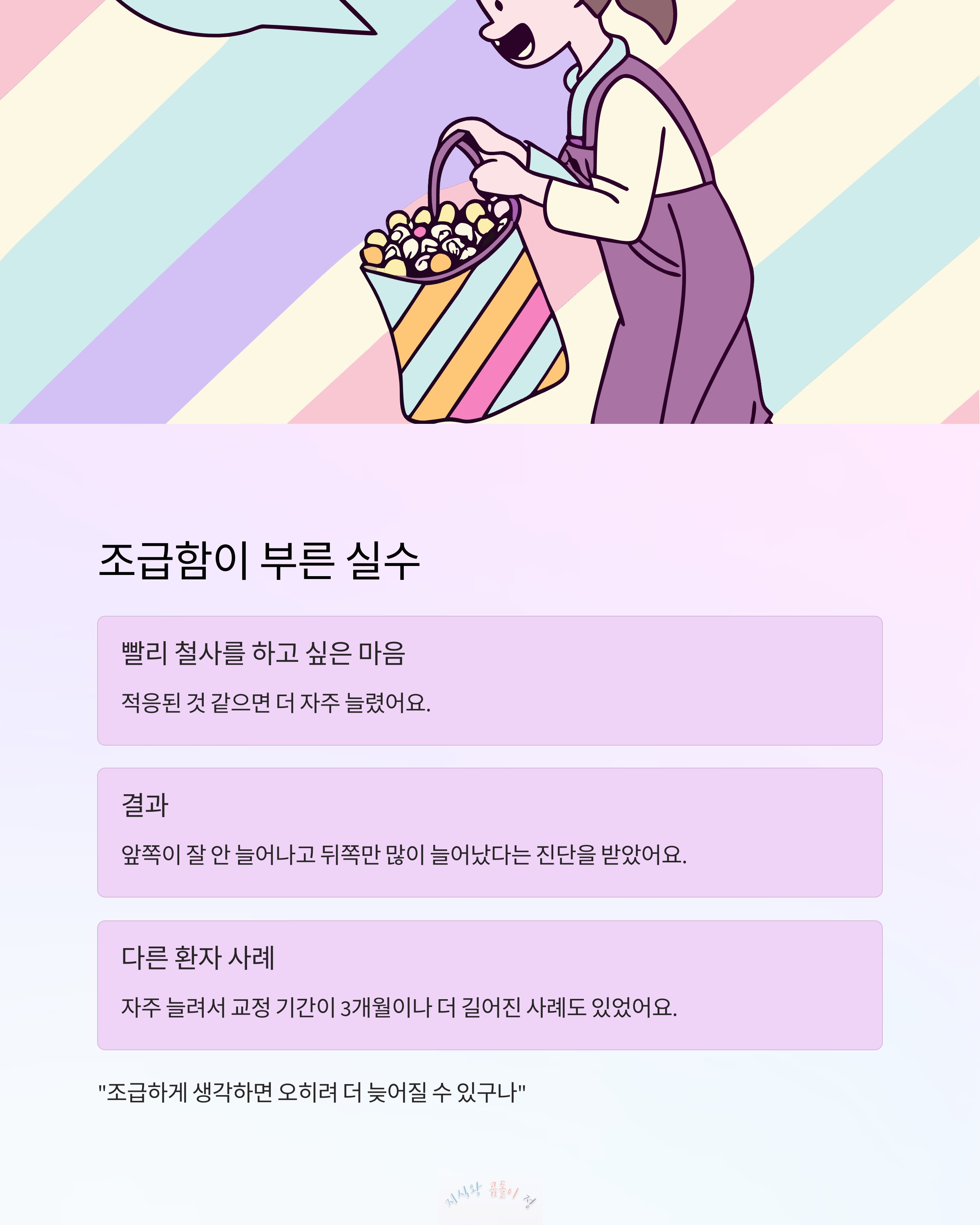 괜히 혼자 서둘렀다가 교정 기간이 더 늘어날 수 있으니까요.