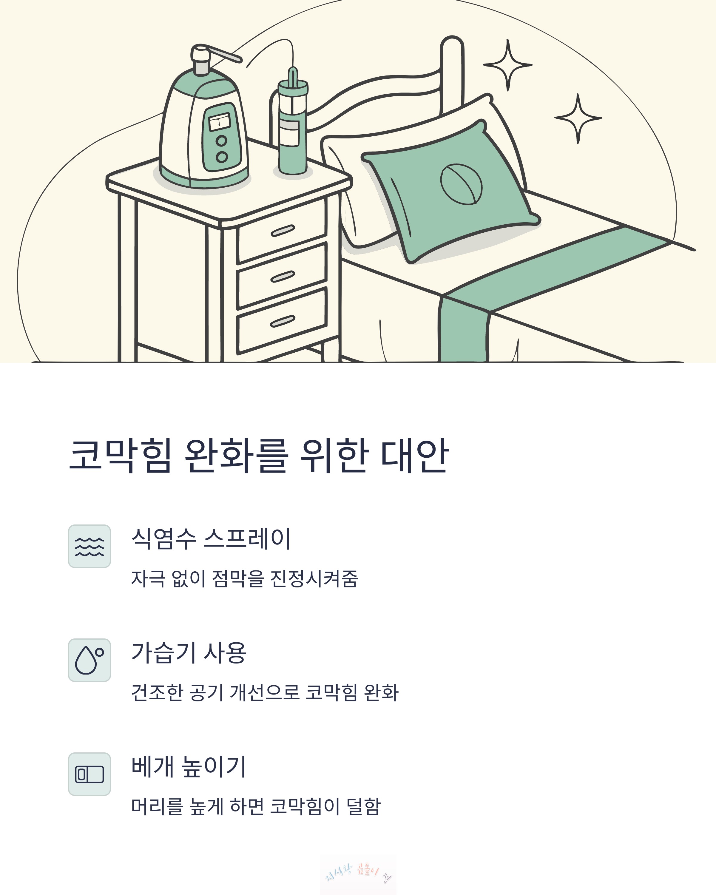 밤에 가습기를 틀고 자니 조금 나아졌어요. - 머리 높이 조절: 베개를 높게 하면 코막힘이 덜하다는 걸 알게 됐어요.